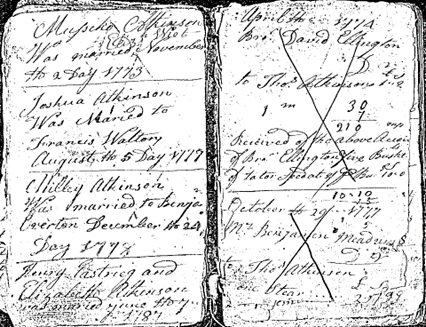 [21] Musco Atkinson married on 2 November 1773. Atkinson, Thomas. Account Book, 1755-1829. N.p., 1755, Print. Library of Virginia, Richmond, Virginia