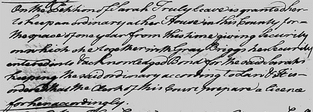 After her husband’s death, Sarah (Holt) Truly remained in Amelia County, but in 1763 she was forced to sell their 300 acre farm to pay debts. After losing their land, Sarah (Holt) Truly ran their tavern for a while, but debt problems continued.