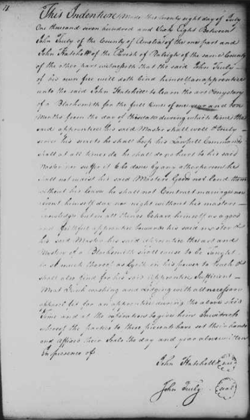 [17] Being bound to a master to learn a trade was typically something that happened to a boy when he was between 10-14 years old and lasted until the person was 21 years old. In John’s case I suspect he was 19 and the one year and 10 month term was to coincide with his reaching 21 [b.c. 1749].