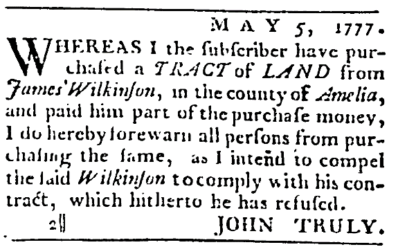 On 5 May 1777, John Truly placed a notice in the 9 May edition of the Virginia Gazette concerning some land he was trying to purchase. The notice reads “Whereas I the subscriber have purchased a certain tract of land from James Wilkinson, in the county of Amelia, and paid him part of the purchase money, I do hereby forewarn all persons from purchasing the same, as I intend to compel the said Wilkinson to comply with his contract, which hitherto he has refused.”[21]