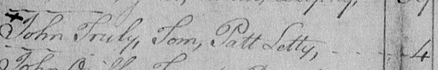 It is only when he writes his will that we learn some of the named of the enslaved held at that time. Daughter Sarah (Truly) Craddock Vaughan’s children by Robert Vaughan received six enslaved people named Pate, Will, Squire, Jerry, Tom and Fanny and her future children. Daughter Jenny Truly received enslaved people named “Big Bette and her six children (to wit) Jim, George, Mary, Bob, Hall, Effie also one Negro girl Mariah.” Was “Big Bette” the “Betty” willed to Jane (Hatchett) Truly by her father in 1784?