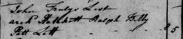 John Truly, Sr., b.c. 1749, Amelia County, Virginia, d. 1804, Amelia County, Virginia, m. abt. 1770, Amelia County, Jane Hatchett, b.c. 1750, Amelia County, Virginia, d. bef. 23 July 1803, Amelia County, Virginia, issue: