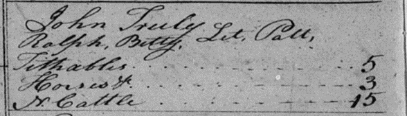 He does appear on extant Amelia tithe lists during the period. In 1778, John Truly was taxed on three tithables including himself and an enslaved man and woman named Bob and Patt.[25] A year later, Bob was gone and Tom and Letty joined the enslaved Patt.[26] There is no extant list for 1780, but for 1781, the record states John Truly’s list, meaning he was not living there. Was he away fighting in the British Legion? His brother-in-law Arch Hatchett is there with the enslaved Ralph, Betty, Patt and Lett.[27] Betty was bequeathed to Jane (Hatchett) Truly in her father’s 1784 will described as “my Negro girl Betty and her increase which she has now in [her] possession.”[28] In in 1782 Amelia County personal property tax list includes John Truly with five tithables – himself and the enslaved Ralph, Betty, Let and Patt. He owned three horses and 15 head of cattle.[29]
