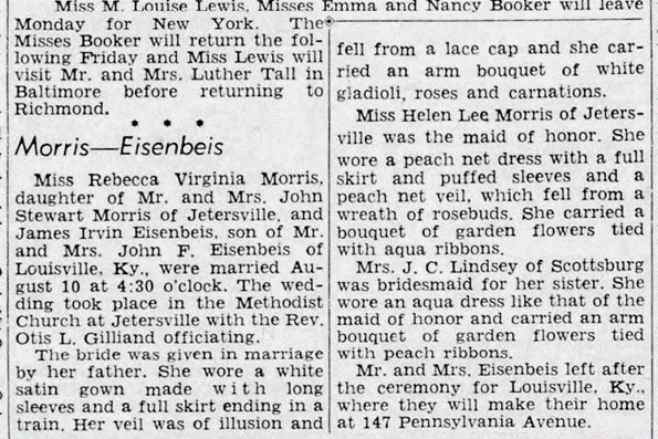 Time rolled on Jimmie wanted to marry, but I didn’t know how we’d ever make it financially. I was in my glory working for the pediatrician in Louisville [and] was scared to death to ask him if he would allow his jack-of-all-trades to marry. One day a fellow came in the office and told me he was moving into a house. His apartment was renting for $25 a month! I thought surely we could swing that so that was our first home.” “I, of course, wanted to come home to Va to be married. My rector was in Michigan – impossible for him to marry us so I sent my mother a telegram to make the arrangements for August 10th 1939 in the Methodist Church with my sisters and brothers in attendance. My dad gave me away – Jimmie, like all men, got a thrill watching the sun shine through my sisters’ skirts, all he could see were their legs! Just after the minister pronounced us man & wife we turned to leave when down on our heads came all this rice! I couldn’t imagine the minister throwing the rice. Later we found the culprit to be my brother – he and his girlfriend got such a thrill from our wedding they announced to us as we were leaving for Ky that they had were marrying the next weekend! This was her brother John Corlise Morris and his girlfriend Florence Ethel Kniceley who married on 25 August 1939. See my earlier post A Letter From Home: https://wordpress.com/post/asonofvirginia.blog/294