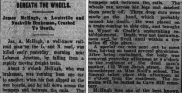 “Jas. A. McHugh, a well-known railroad man on the L. and N. [Louisville & Nashville] road, was killed early yesterday morning near Lebanon Junction, by falling from a rapidly moving freight train. About 5 o’clock McHugh, who was brakeman, was running from one car to another, when his foot slipped on the wet boards, and he fell down across the bumpers and between the rails. The wheels ran across his legs and mashed them nearly off. Three deep cuts were made on the head, which probably caused his death. He was placed on a train coming to this city [Louisville] and brought to Wyatt & Cralle’s undertaking establishment. Death was not instantaneous, and he lived until within a few miles of this place.” [1]
