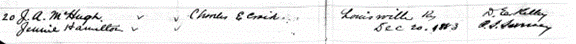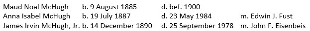 James Irvin McHugh, Sr., b.c. 1853, Pennsylvania or Ireland?, d. 25 September 1890, Louisville, Kentucky, m. 20 December 1883, Louisville, Kentucky, Jane “Jennie” Hamilton (1860-1945), issue: