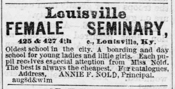 Miss Nold’s school was called the Louisville Female Seminary. A description of the organization from 1895 reads as follows: “The Louisville Female Seminary, for young ladies and children, founded in 1851 by the Late Mr. and Mrs. W.B. Nold. The present principal, Miss Annie F. Nold, has had charge of the school for the past 15 years. The original plan of work has been continued as far as possible, and the reputation of the school maintained. The school is divided into primary, intermediate and seminary departments. The course of study is comprehensive. The faculty is composed of specialists. The number of boarding pupils is limited. The school is situated in the most desirable residence part of the city near Central Park.”[15]