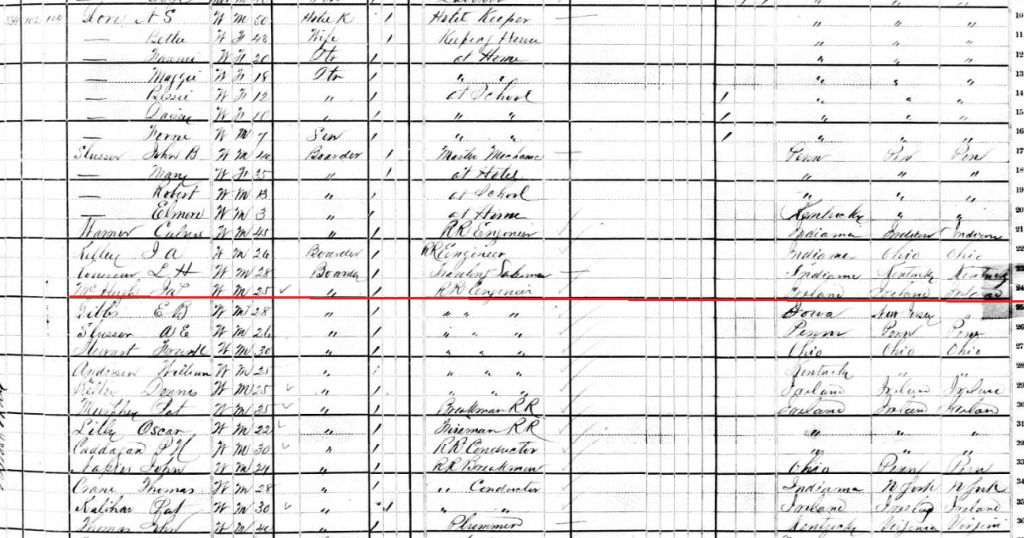 In 1880, the Louisville city directory lists James A. McHugh, Engineer, L&N railroad boarding at the Broadway Hotel.[14] This and the 1880 census listing him as living in a hotel at 334 Broadway gave me confidence this was my James McHugh. I reviewed extant city directories from 1875-1892 for the surnames McHugh and McCue to see if I could track him over time. Turns out James McHugh was not an uncommon name in Louisville during the period. Some – probably most- were renters and frequently moved within the city and others are inconsistently listed. Believe it or not there is actually another James McHugh – also sometimes listed as James A. McHugh – who was also a railroad engineer! His family I can track, but he’s not mine. My James McHugh’s widow Jennie McHugh is listed in Louisville city directory consistently as – widow of J.I. McHugh – but just as often he is listed as just James. Twice he is “J.E.” and once he was “J.A” just to keep it interesting.