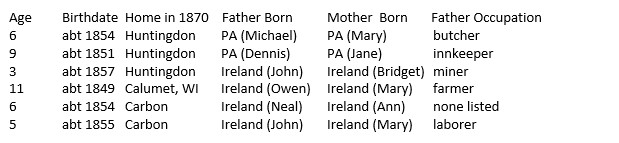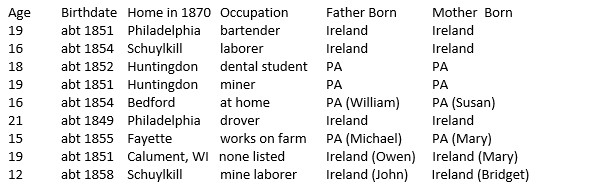 In 1870, there were nine James McHugh’s born in Pennsylvania between 1849-1858 (1853 +/- 5 yrs):