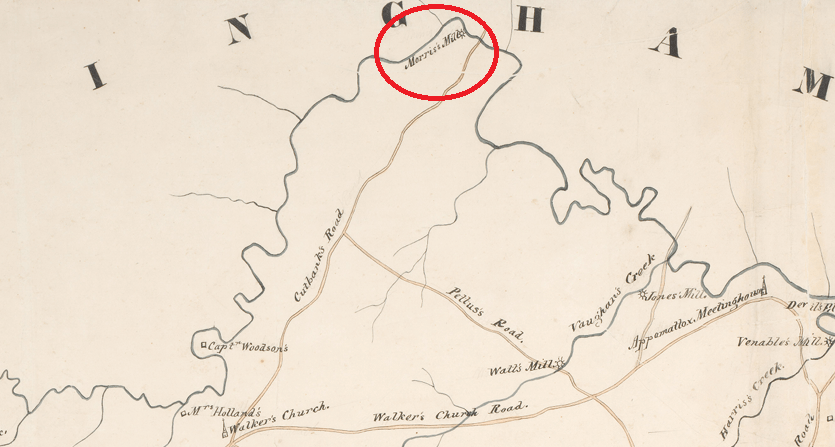 On 18 May 1818, John Morris of the County of Buckingham sold to Charles Woodson, Escheator for the county of Prince Edward, the land of John McMurry who died without heirs. It’s possible that John Morris was serving as the estate administrator, a role he filled many times during his time as a Buckingham justice of the peace. This parcel of 422 ¾ acre tract was located “upon Appomattox on the east side of the road leading from Peter Fores to the cut banks upon said river.” It was described as “bounded by cut bank road and the lands of said Morris to the west, land of Mrs. Hubbard also westwardly, lands of John Cheadle & Mrs. Arnold Southwest, Appomattox River East and North, and lands of Isham Gillam & Silas Watkins opposite in the county of Buckingham.”[1] The reference to “lands of said Morris” indicates John already owned land in Prince Edward County by 1818, but I have found neither patent nor deed for his prior acquisition.