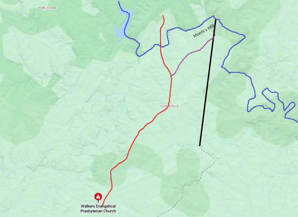 Claude descends from Nicholas Hudson Morris (c.1770-c.1846) called “Hudson” while I descend from Nathaniel Morris (c.1745-1813). While we are not related (that we know of!), we both love history. I mentioned to Claude that that I wanted to come back and find Morris’s Mill, which was associated with Cutbanks Plantation. The Plantation and Mill are associated with two generations of my Morris ancestors including Nathaniel’s son John Morris (1779-c.1862) and John’s son John James Morris (1812-c.1857) called “James.”