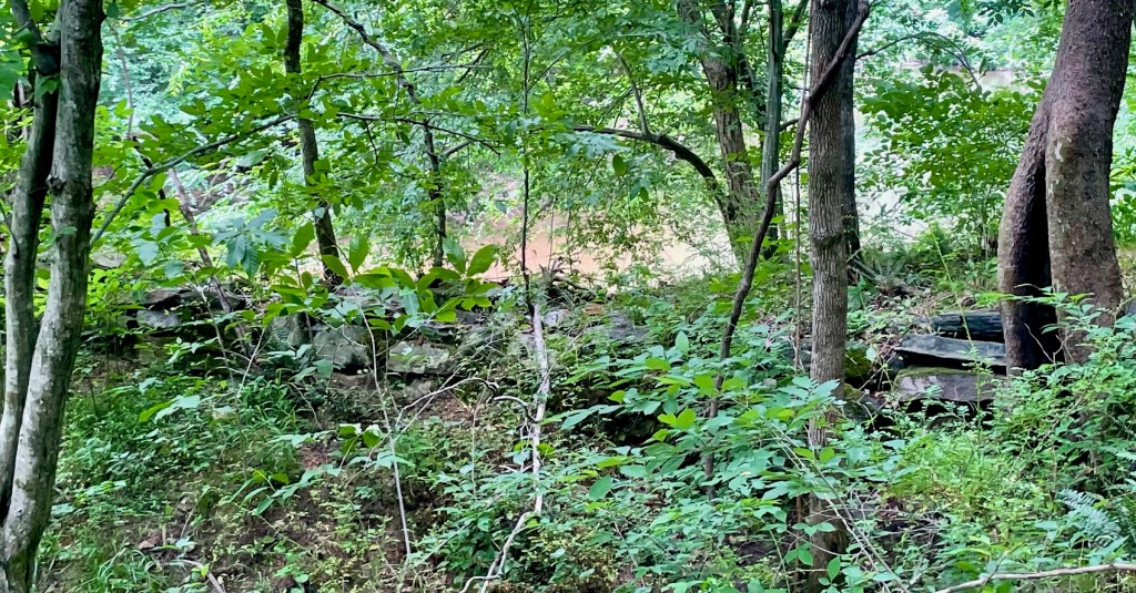 In one of those small world coincidences, Claude’s cousin Larry Morris is the current owner of Cutbanks Plantation. Larry gave us permission to visit and was kind enough to do some weed eating to make access easier for us. Independently of meeting Claude, I met L.D. Phaup through a Buckingham County genealogy researcher group. L.D. also loves history and as it turns out Claude and L.D. are friends so we decided we should all go exploring together. We met up with another history lover, nine-year-old Kemp Beasley, whose family live nearby and who is well known to Claude and L.D. We stumbled around a bit, but found the old mill site fairly easily.