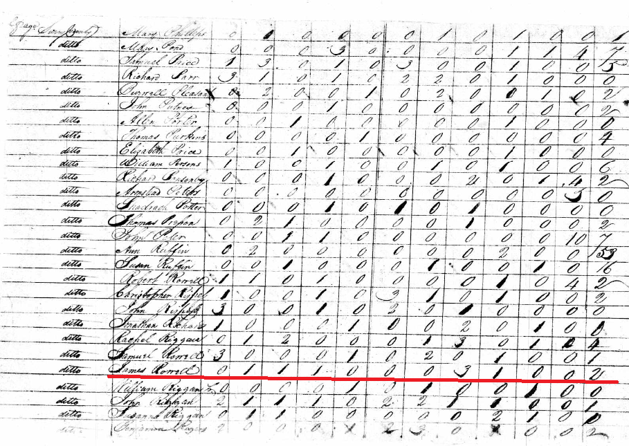 Neither Richard Rowell IV nor his mother Sarah (Gray) Rowell appear in the 1810 federal census; however, Richard Rowell III’s Estate is listed as paying tax on 100 acres throughout the period.[5] The family, while not identified in the census record, were evidently still together with eldest son James Rowell (c.1784-1853) listed as head of household. The household included 1 WM 26-44 – James Rowell, 1 WM 16-25 [prob. brother Richard Rowell IV b.c. 1791] and 1 WM 10-15 [prob. brother John D.G. Rowell b.c. 1800], 1 WF 26-44 [prob. mother Sarah (Gray) Rowell] and 3 WF 16-25 [prob. sisters Polly, b.c. 1786 and Nancy [b.c. 1796] and his new bride Betsy (Gray) Rowell whom he married 27 March 1810].[6]