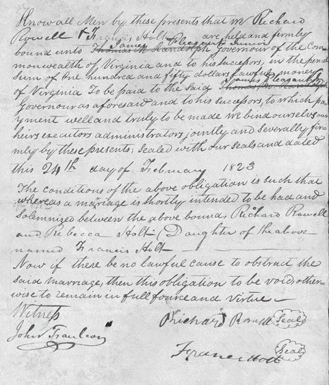 On the 24th of February 1823, Richard Rowell and Francis Holt bound themselves to the James Pleasants, Governor of Virginia in the amount of $150. This was for a marriage bond that reads in part “whereas a marriage is shortly intended to be had and solemnized between the above bound Richard Rowell and Rebecca Holt, daughter of the above named Francis Holt . . .“[1]