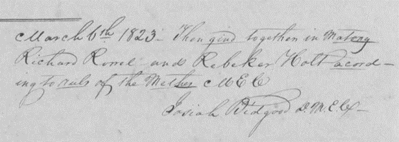 Richard Rowel and Rebeker Holt were married on 6 March 1823 by the Rev. Josiah Bidgood