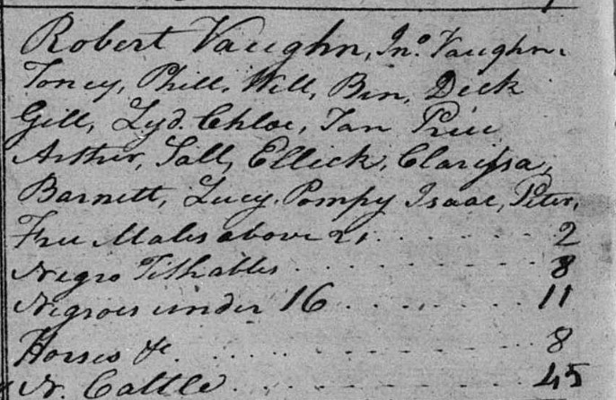 When he wrote his will in 1800, Robert Vaughan mentioned 28 enslaved people by name, but the wording suggests that those named had children and/or grandchildren that were not named. Those named included Phill, Len, Ben, Barnett, Fanny, Lyddia, young Len and Syrita, Arthur & Judy, Daniel & Phillis, Phillis & Lucy, Lucy & Amy, Pompey & Clarissa, Ellick & Sally, Dick & Patt, Prue, Nancy, Claiborne, Anderson, Wilson and Vina