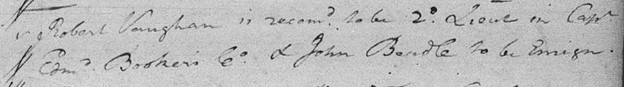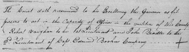 Robert Vaughan II was recommended as a 2nd Lt. in Captain Edmund Booker’s Company by the Amelia Court on 28 August 1777.[6] The following month, he produced a commission from his Excellency, the Governor and took his oath.[7] On 22 June 1780, Robert Vaughan was recommended by the court to be 1st Lt. in Booker’s Company.[8]