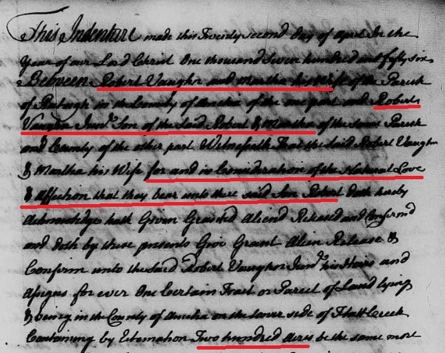 On 22 April 1756, Robert & Martha (———-) Vaughan gifted their son Robert Vaughan, Jr., 200 acres of land on the lower side of Flat Creek for the “natural love and affection they bear unto thee the said son.” The deed mentions that the tract crossed Vaughan’s Creek [formerly Frank’s Creek] below Robert Vaughan’s plantation [Robert I, the father].[1] Robert II’s siblings Phoebe (Vaughan) Mayes, Nicholas Vaughan, James Vaughan and Willis Vaughan all lived on adjacent tracts.