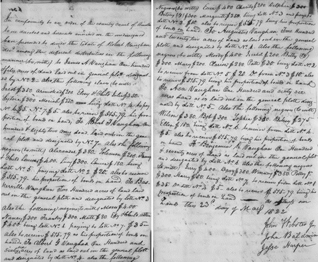The 58 enslaved men, women and children held by Robert & Sarah (Truly) Craddock Vaughan were similarly divided between his widow (one-third) and seven sons (one-seventh of the remaining two-thirds).