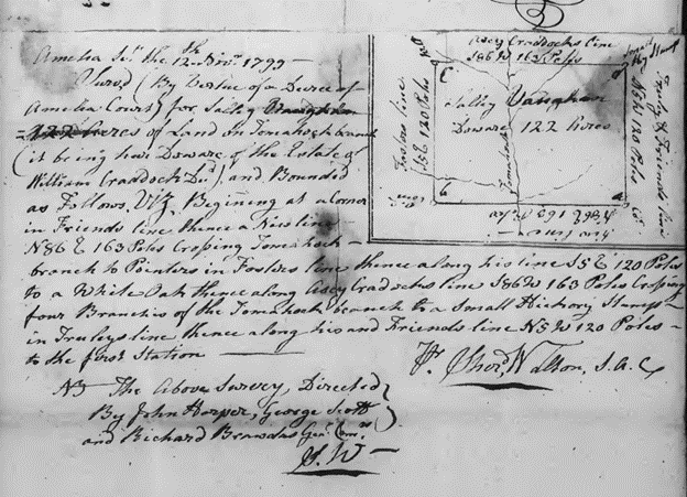 Not long after their 1799 marriage, Robert III and Sarah (Truly) Craddock Vaughan filed suit in Amelia County Chancery Court to secure her dower interest [7] in her first husband’s estate. William Craddock died intestate [without a will] and by law his widow was entitled to the use of one-third of his real and personal estate for her life or widowhood. The other two-thirds was due to his heirs – in this case one daughter – Jane Hatchett Craddock – who would ultimately inherit her mother’s dower interest as well. Practically speaking, Robert and Sarah (Truly) Craddock Vaughan would have managed the entire estate until Jane Hatchett Craddock came of age or married.
