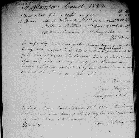 Dying intestate [without a will] meant that Robert Vaughan III’s estate would be divided according to Virginia law through the Chancery Court system. Generally speaking, a widow was entitled to the use of one-third of her husband’s real and personal estate for her lifetime or widowhood. The other two-thirds would be divided among the heirs. In this case – the seven sons of Robert Vaughan III. As such two chancery suits were filed in Amelia County in January 1821 and March 1821.[20] The eldest son James Armistead Vaughan appears to have reached the age of majority at about this time, which likely prompted the non-controversial suits.