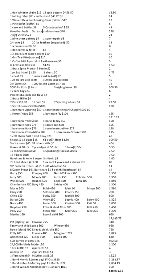 Robert Vaughan III was dead by August 1820[17] when the Amelia County Court ordered an inventory and appraisal (I&A) of his personal estate. The I&A was returned by the appraisers to the court on 14 September 1822. It is extensive and includes furniture, household goods, farm equipment, tools, horses [all named], cattle, pigs, oxen as well as harvested corn and fodder. Robert Vaughan III’s inventory also includes the names of 58 enslaved men women and children valued at $18,810 of a total personal estate value of $28,931.[18]
