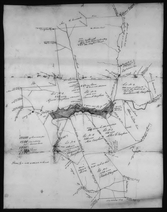 The widow Sarah Vaughan’s dower included 577 ½ acres with the “Mansion House” and a 66 ½ acre tract called the “Canoe Tract.” Their seven sons drew or were assigned lots as follows: