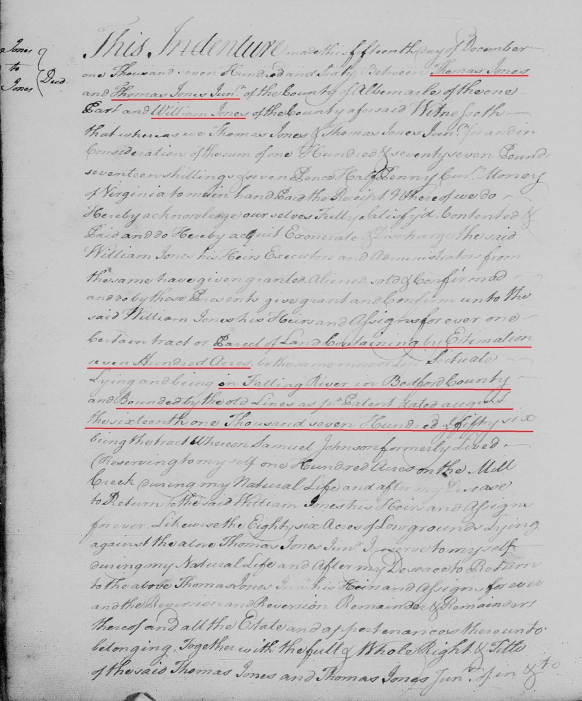 [15] Bedford County, Virginia Deed Book 1 1754-1762, p. 358; https://www.familysearch.org/ark:/61903/3:1:3Q9M-CSL6-M369-1?view=fullText&keywords=Thomas%20Jones%2CFalling&groupId=M9J3-FWV