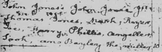 John Jones, John Jones, Jr.[16-20 in 1773 (b.c. 1753-1757)], Thomas Jones [16-20 in 1773 (b.c.1753-1757)][18] Mark, Roger, Joe, Harry, Phillis, Angeller, Sook and Barybery the Miller (10 tithes – Henry Bell’s list).[19]