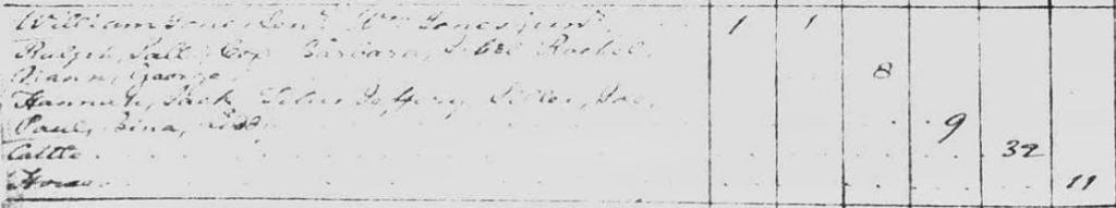 Joel Walker Jones 1-0-0-0-0-3-0 – [him and 3 enslaved] – Abraham, Buxton, Ledy, Phillis (not tithable), 18 cattle, 6 horses[24]