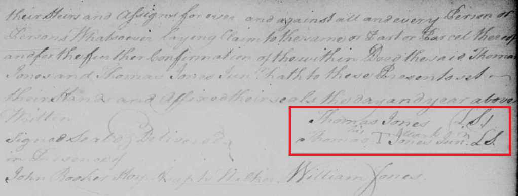Observations/Thoughts: In the 1760 Deed to Hoy, Thomas, Sr and William could sign their names, while John made his mark. In the 1760 deeds to John and William, Thomas Sr. signed his name while Thomas Jr. made his mark. Thomas Jones, Sr. also wrote the will of Samuel Glover in 1746 so he had to have been able to read and write. How is it that two of his three sons couldn’t sign their names well into adulthood? Thomas Jones, Sr. was about 50 years old when he received his 1740 Goochland County grant. Where did he learn to read and write in a time when the significant majority of people were illiterate? This feels like an important clue to finding out about the origins of Thomas Jones of Slate River.