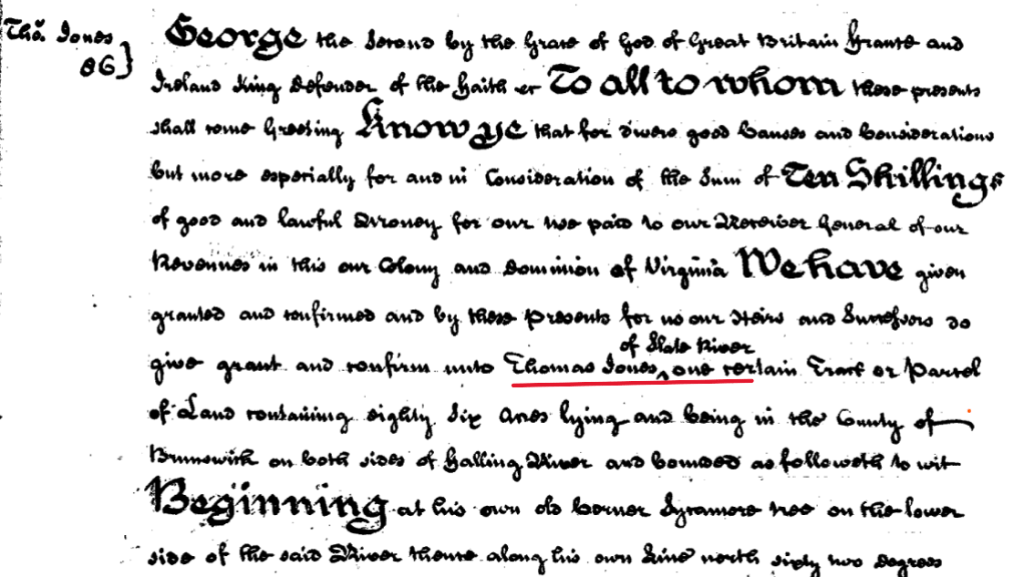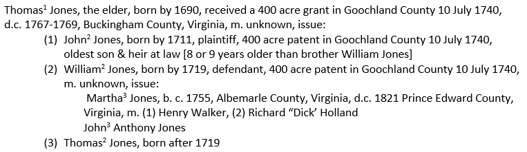 [1] (Thomas Jones) Land Office Patents No. 19, 1739-1741, p. 675 (Reel 17), (John Jones) Land Office Patents No. 19, 1739-1741, p. 672 (Reel 17), (William Jones) Land Office Patents No. 19, 1739-1741, p. 674 (Reel 17), Library of Virginia