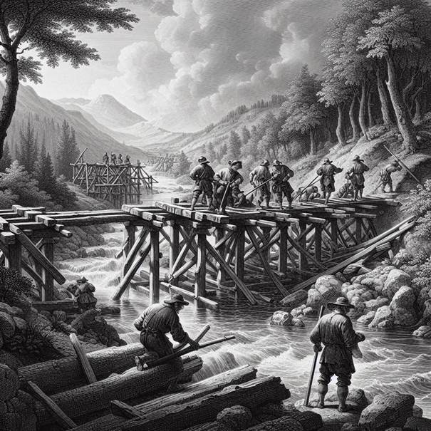 Carpenters building a bridge over a small river in colonial Virginia. An Artificial Intelligence (AI) generated image using Microsoft Bing Image Creator.