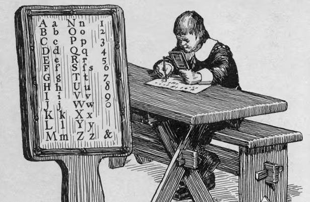 Illustration showing a hornbook in the foreground, and a young colonial boy studying from his hornbook, in the background. The hornbook was a primer for children, often listing the alphabet. Interim Archives/Getty Images