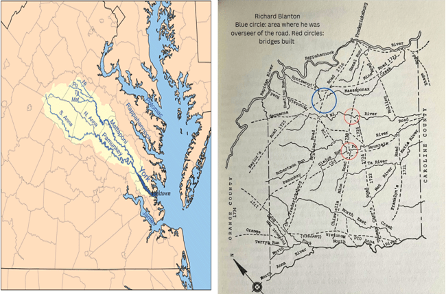 At left: Map of portion of Virginia showing the York River splitting into the Mattaponi and Pamunkey Rivers and then the Mattaponi splits into the Matta (which further splits into the Mat and Ta) River, Po and Ni Rivers while the Pamunkey splits into the North Anna and South Anna Rivers. At right: the areas in Spotsylvania County where Richard Blanton I engaged in road and bridge building and maintenance.