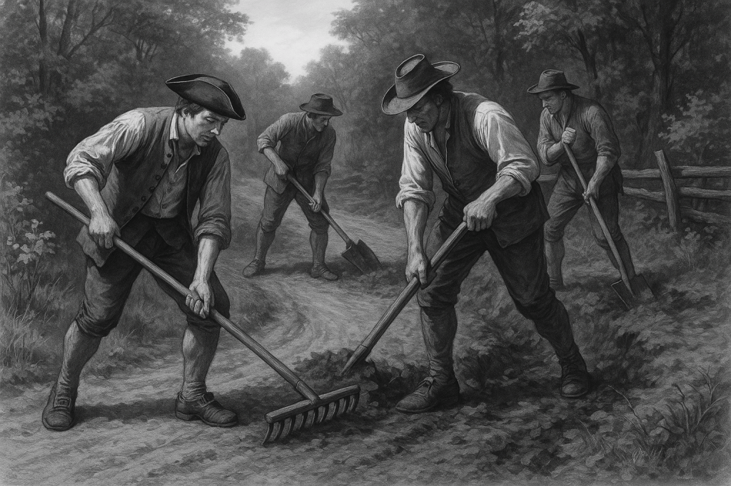 Men maintaining a road in 1730s colonial Virginia. An Artificial Intelligence (AI) generated image using Microsoft Image Creator.