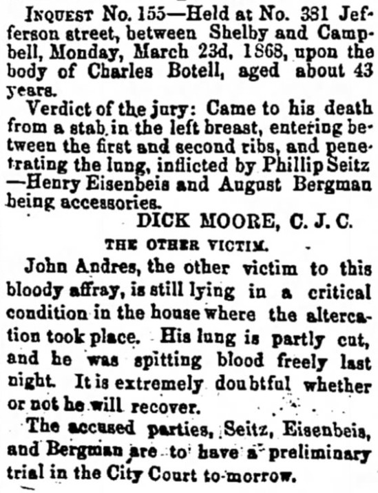 Having spent much of the War in Louisville, Henry Eisenbeis moved his family across the Ohio River to make it their home about 1865. He and wife Susan had one son named Frederick born in February 1862. They began expanding their family welcoming sons Anton William, born in June 1865 and Joseph Peter, born in March 1867. Susan was about four months pregnant on the evening of 22 March 1868, when Henry decided to go out with friends. Between 8-9 pm, Henry Eisenbeis, August Bergman, and Philip Seitz entered Mr. Boesser’s saloon on Jefferson Street and ordered three beers. Charles Botell was sitting in the bar. August Bergman jumped up and asked Botell, “What have you to say of my wife?” To which Botell replied, “I do not know your wife.” During the tense exchange, Henry Eisenbeis and Philip Seitz went out the back door of the saloon into the alley joined shortly afterward by Bergman, Botell and a man named John Andrea. Within a few minutes, Charles Botell was stabbed and killed, and John Andrea was fighting for his life.