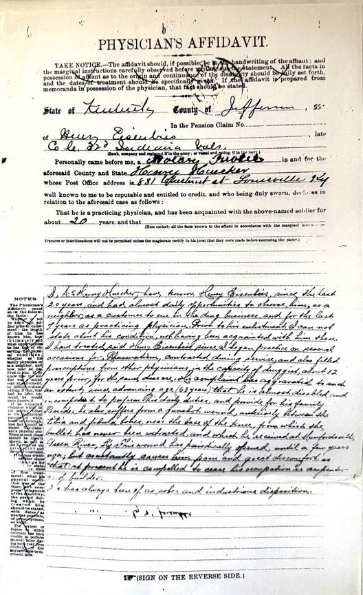 In May of 1879, when Henry Eisenbeis filed for his invalid pension, an accompanying physician’s affidavit reported that he had treated Henry for “rheumatism, contracted during service” for some 12 years and that Henry’s “complaint has aggravated, to such an extent, since advancing age (63 years) that he is almost disabled.” The doctor added “Besides, he also suffers from a gunshot wound, anteriorly between the tibia and fibula bones, near the base of the knee, from which the bullet has never been extracted, and which he received at Munfordsville, Green River. This wound has periodically opened, until a few years ago, but constantly causes him pain and great discomfort, so that at present he is compelled to cease his occupation as carpenter and builder.”