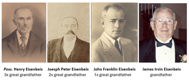 I have been unable to find anything about Henry Eisenbeis in Europe. Closer to home another mystery endures. After my grandfather died in 2006, I found a charcoal portrait in his office closet. Charcoal portraits were popular from the 1880s into the early 1900s. I have photographs of 14 of 16 2x great grandparents and several 3x great grandparents so I know who it is not. I think it is Henry Eisenbeis. The style of clothing he is wearing – a sack suit, waistcoat (vest), high collared shirt and tie and his beard – suggests 1880s when Henry was in his 60s. The only description of Henry Eisenbeis is from his 1879 pension application, which states he had “light eyes” and “light gray hair.” Seems to fit the bill. The most compelling evidence, however, is the comparison to my other Eisenbeis ancestors. Notice anything similar? Yep – all were follicly challenged. Notice that they all parted their hair on the left side as well. What do you think?