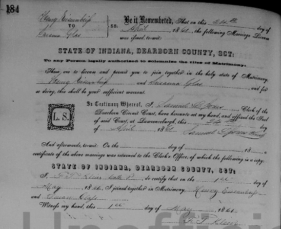 Soon after his arrival in New York, he made his way to Aurora, Indiana, where there was a large German immigrant community. On 24 April 1861, just 11 months after his arrival in the United States, he and another recent Bavarian immigrant, Susanna Glas (1840-1901), obtained a marriage license. They were married on 18 May 1861 in Aurora, Indiana.