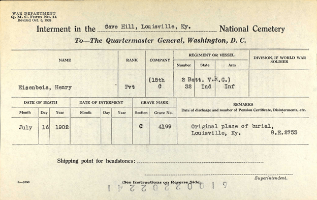 Susanna “Susan” (Glas) Eisenbeis died of consumption on 2 May 1901 at the age of 59 and was interred at St. Michael’s Catholic Church in Louisville, Kentucky.[19] Henry Eisenbeis died on 16 July 1902 at the age of 76 and was interred alongside his fellow soldiers at Cave Hill Cemetery.