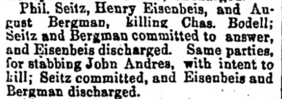 After a few continuances, the men’s preliminary hearing was held on 2 April 1868. The same four witnesses from the coroner’s inquest testified as did John Andrea, the other victim who had recovered enough to testify that Seitz had stabbed Botell four times with a butcher knife. He further testified that Seitz had stabbed him as well – twice in the back.[13] At the end of all of the testimony, Seitz and Bergman were “committed to answer” for the murder of Charles Botell while Eisenbeis was discharged. Seitz was also committed to answer for the stabbing of John Andrea with both Eisenbeis and Bergman being discharged.[14] Ultimately, Seitz was convicted of manslaughter.[15]