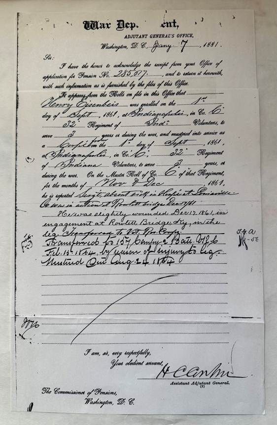 [10] U.S. Dept. of the Interior, Bureau of Pensions, Report on Henry Eisenbeis Civil War Service, dated March 1900
