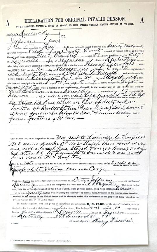 Interestingly, in a communication from the War Department dated 7 January 1881, Henry’s wound was described as “He was slightly wounded Dec 17, 1861 in engagement at Rowlett’s Bridge, Ky, in the leg.”