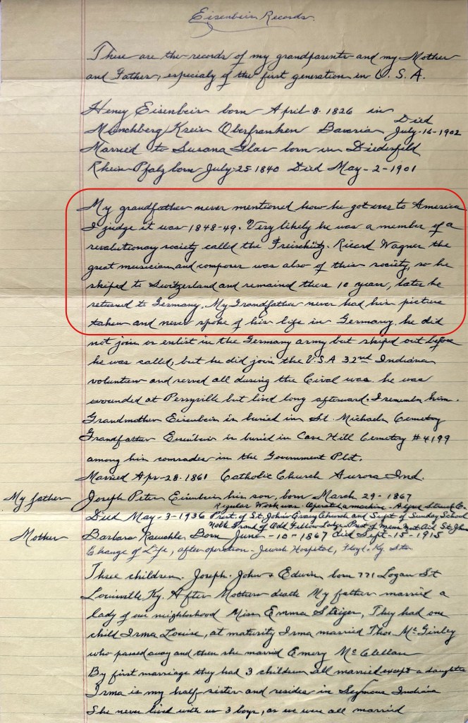 Uncle Joe knew his grandfather Henrich Eisenbeis personally, the latter having died when Joe was 11 years old. Uncle Joe replied to my first letter in 1976 enclosing a handwritten narrative of his grandfather. He wrote “my grandfather never mentioned how he got over to America. I judge it was 1848-49. Very likely he was a member of a revolutionary society called the Freischütz.[2] Richard Wagner the great musician and composer was also of this society[3], so he [Wagner] skipped to Switzerland and remained there for 10 years, later he returned to Germany. My grandfather never had his picture taken and never spoke of his life in Germany.”