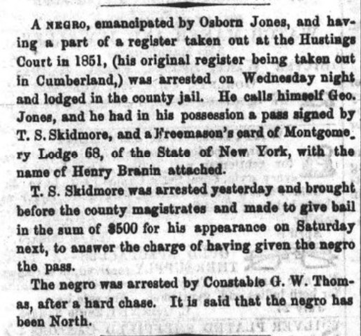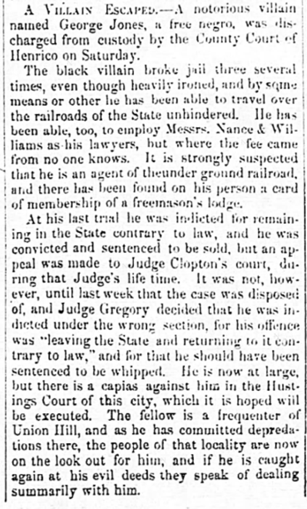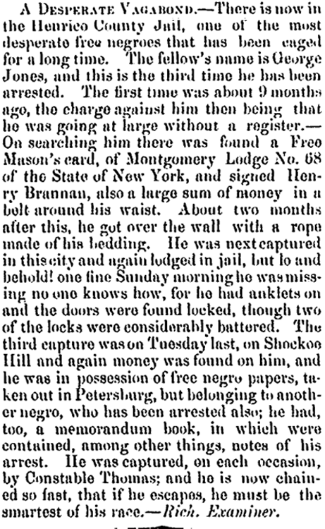 Captured once again, a November 1860 article published by the Richmond Enquirer announced that “a notorious villain named George Jones, a free negro, was discharged from custody by the County Court of Henrico on Saturday.” The paper reviewed his escapes, his ability to travel over the railroads “even though heavily ironed,” and the fact that he had retained attorneys Nance & Williams, though “where the fee came from no one knows.” It repeated the suspicion that he was “an agent of the underground railroad,” noted again the Masonic card found on his person, and explained why he had been released.