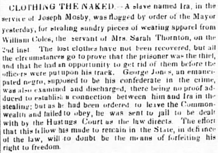 Somehow George managed to get himself released, but he was soon before the court again. On 7 October 1853, city authorities arrested an enslaved man named Ira, enslaved by Joseph Mosby, on suspicion of stealing an overcoat, dress coat, pants, and several vests from another enslaved man. George Jones, suspected of receiving the stolen clothing, was arrested as well.[23]
