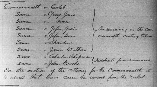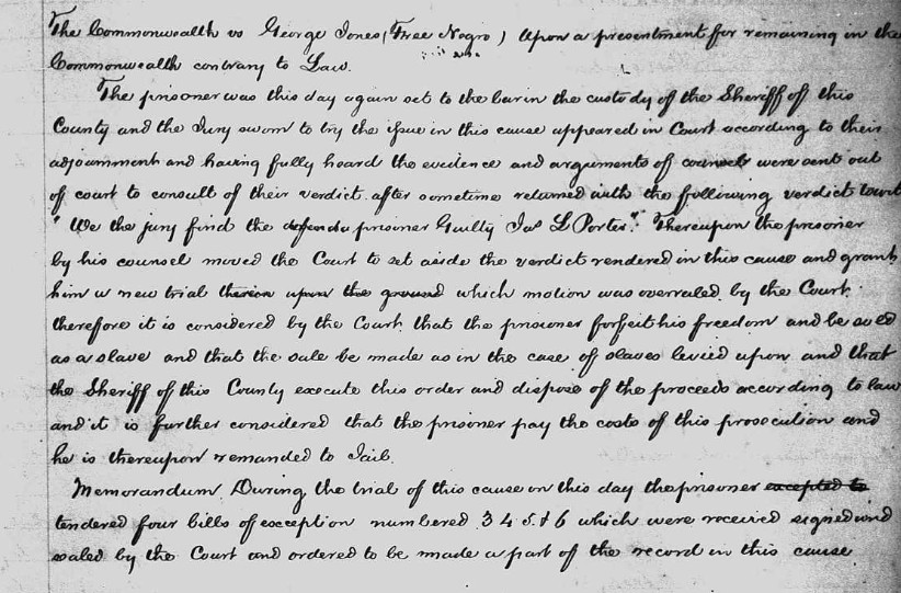 On 18 February 1853, a grand jury in the Hustings Court (Richmond) returned a presentment against George Jones “for remaining in the Commonwealth without leave,” formalizing the charge.[18] The following day, he appeared in court, pleaded not guilty, and the case was continued.[19] The following month, George Jones, by his attorney John N. Davis, appeared in court and tendered an undefined special plea, which the court rejected. His attorney then tendered a bill of exceptions, which the Court received and made part of the record. George was taken into custody.[20] At George’s request, the case was continued through March and April.[21] [22]