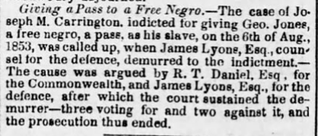 The mayor ordered George to be committed to jail on the charge of remaining in the Commonwealth and sent the question of the forged master‑servant relationship to a grand jury. In November 1853 a jury presented George for remaining and Carrington for issuing the written pass that allowed him to pass as a slave.[26] A year later, the court sustained Carrington’s lawyer’s demurrer and dismissed his case, ending the prosecution against the lawyer. George, meanwhile, continued to face the same underlying charge: he was still in Virginia.