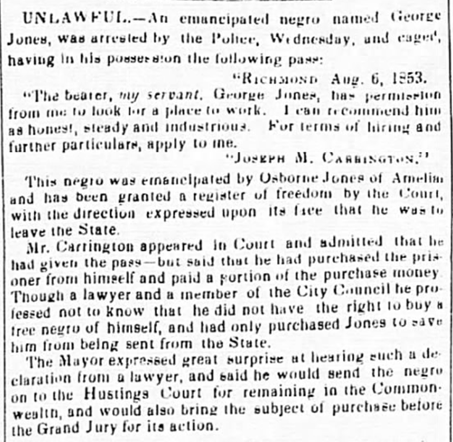 “The bearer, my servant, George Jones, has permission from me to look for a place to work. I can recommend him as honest, steady and industrious. For terms of hiring and further particulars, apply to me. Joseph M. Carrington.”